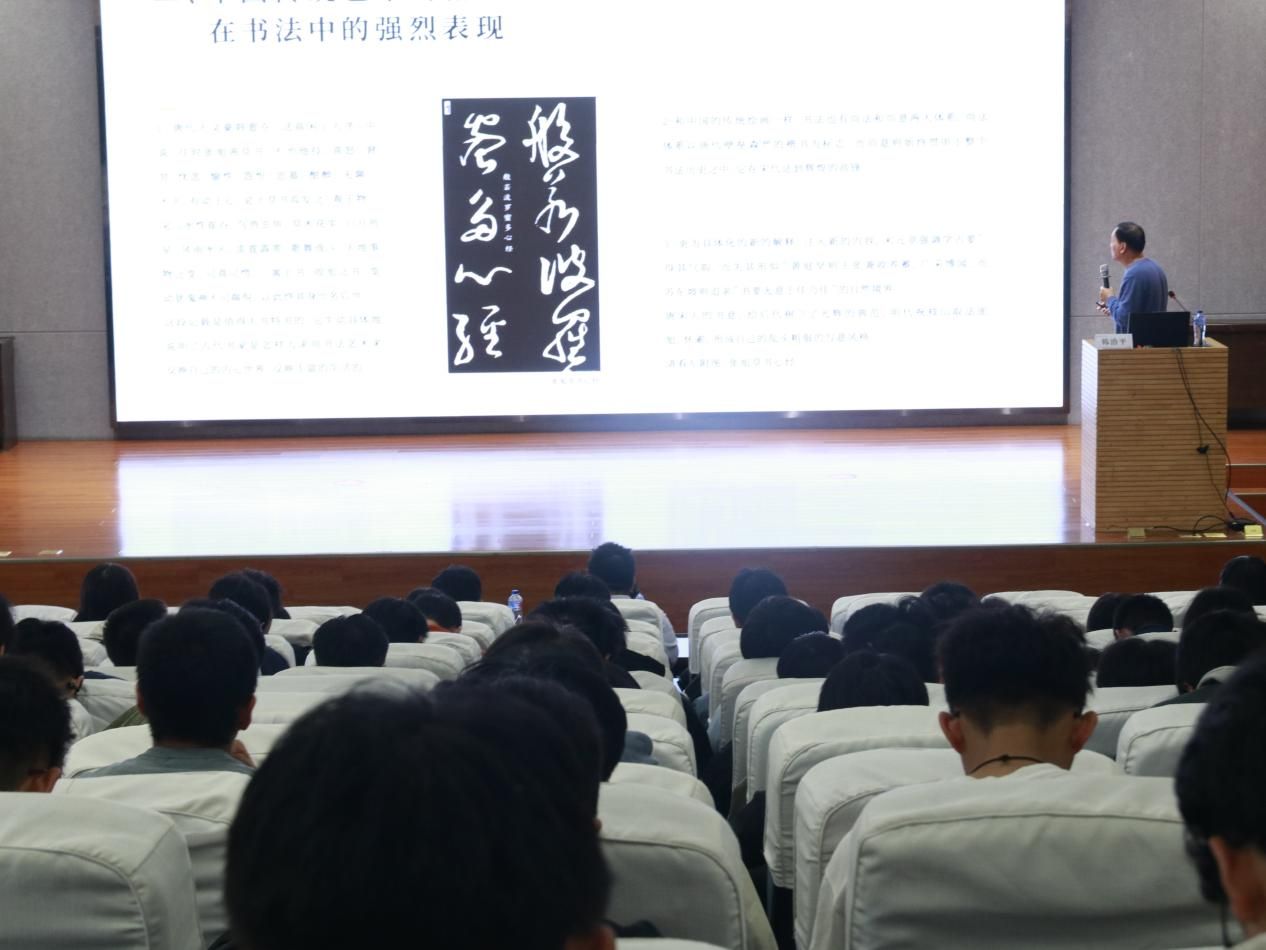 韩治平从欣赏谈起,介绍书法欣赏由浅入深的三个层次,借助古代书法大家的作品和风格,解释书法中表现的“意”。他强调,艺术不仅是审美的对象,更是情感的表达和“气”的输出。他还从艺术创新和书画同源的角度,与学生们共同探讨现代书法,并介绍了中国艺术教育的层次和方向。随后,韩治平展示了多幅经典书画作品,并结合自己的研究,分析这些作品中的艺术技巧和内在思想。每一笔每一划,都让在场的师生感受到书画线条中所蕴含的力量与美感。同学们纷纷表示:“韩院长深入浅出地介绍,让我切身感受到了书画艺术的魅力。”