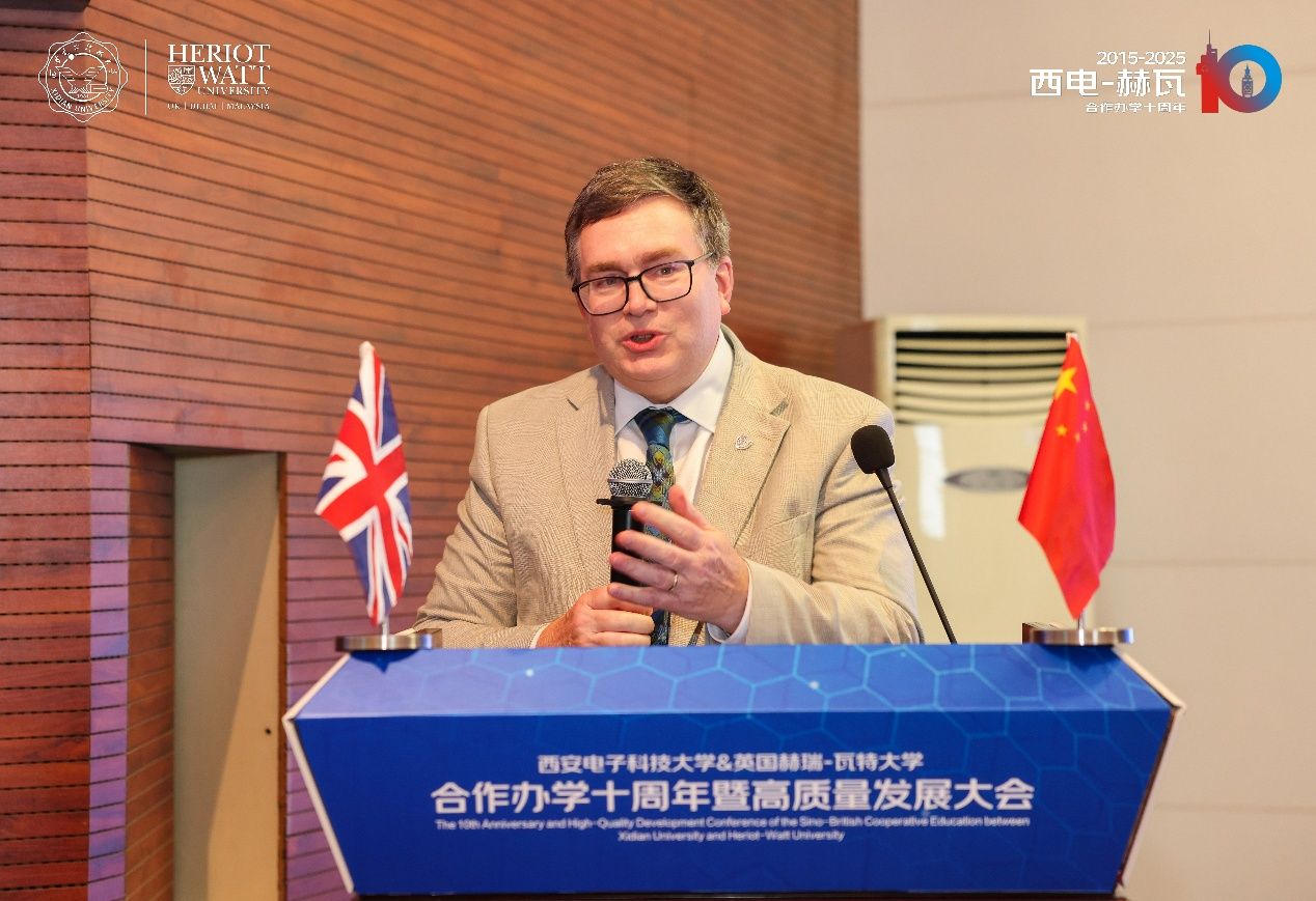 理查德·威廉姆斯介绍了十年来中英合作办学项目的育人成效,通过项目学位数据的提升、里程碑事件的见证等,回顾了两校合作办学历程,进一步传递双方围绕学生、重视学生的教育理念,希望赫瑞-瓦特与金沙娱乐城能够继续竭诚携手共进,开出更美的国际合作之花。