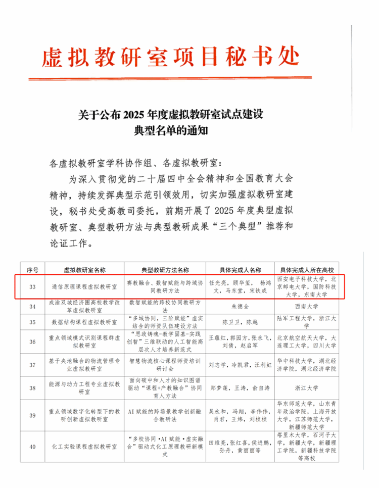 牵头的通信原理课程虚拟教研室申报的“赛教融合、数智赋能与跨域协同教研方法”成功入选“典型教研方法”。