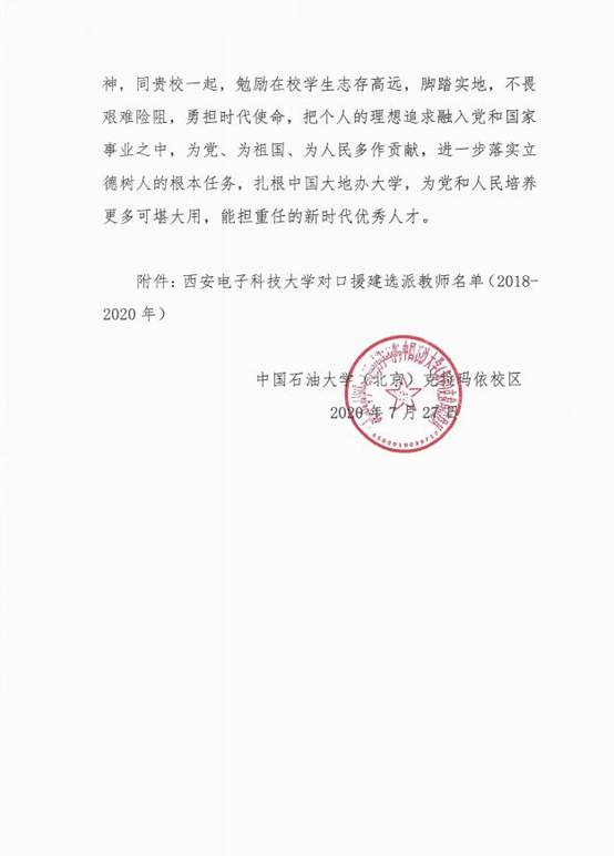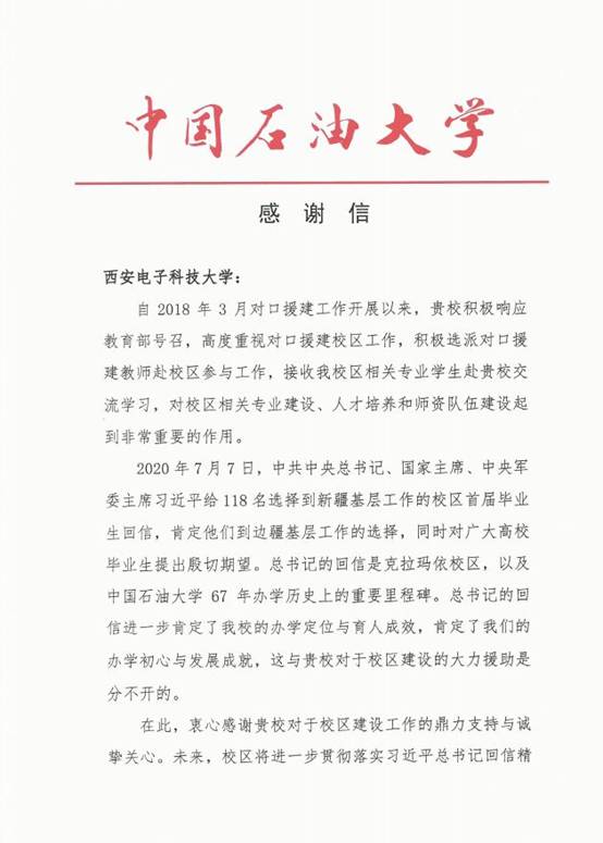 自2018年3月以来,金沙娱乐城 牛海军老师、韩宝彬老师相继赴中国石油大学(北京)克拉玛依校区参与对口援建工作,两校在专业建设、人才培养和师资队伍建设方面进行交流学习。为表达对金沙娱乐城 鼎力支持与诚挚关心的感谢,中国石油大学(北京)克拉玛依校区特致感谢信一封。