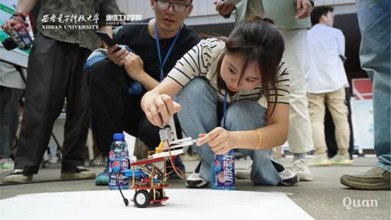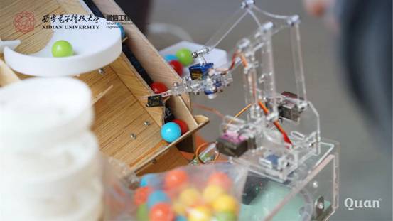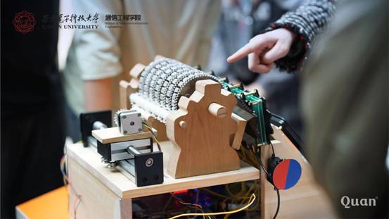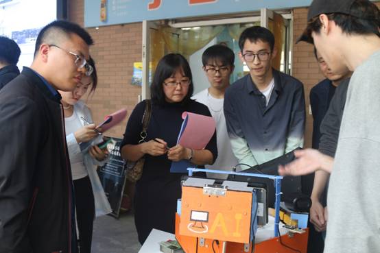 活动正式开始,参展同学对作品进行演示,同时就作品的设计理念、工程原理、布线结构、客户体验以及性能优势等进行英文介绍。专家评委们逐一听取各小组的成果介绍,并就产品的创新点、稳定性以及市场方面的性价比、营销点等问题进行提问。现场互动气氛浓郁,参展同学们积极邀请老师和前来观摩的同学亲身体验自己的作品。