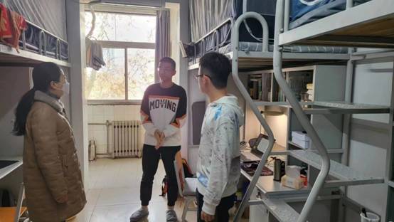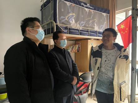 领导带领研究生辅导员、本科生辅导员深入南北校区学生宿舍走访慰问返校学生,与学生深入交流,了解学生返校情况,第一时间掌握学生返校思想状况,及时回应学生诉求。