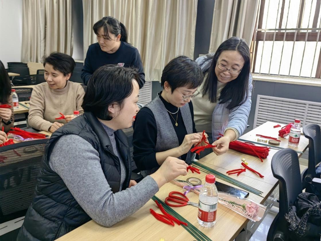 在鲁瑾老师的指导下,在一片欢声笑语中,大家一起动手编织出一支支象征美好幸福的花朵。女教工用心灵手巧,展现出自身极高的审美素养,用美丽的花朵寄语对未来生活红红火火的期盼。